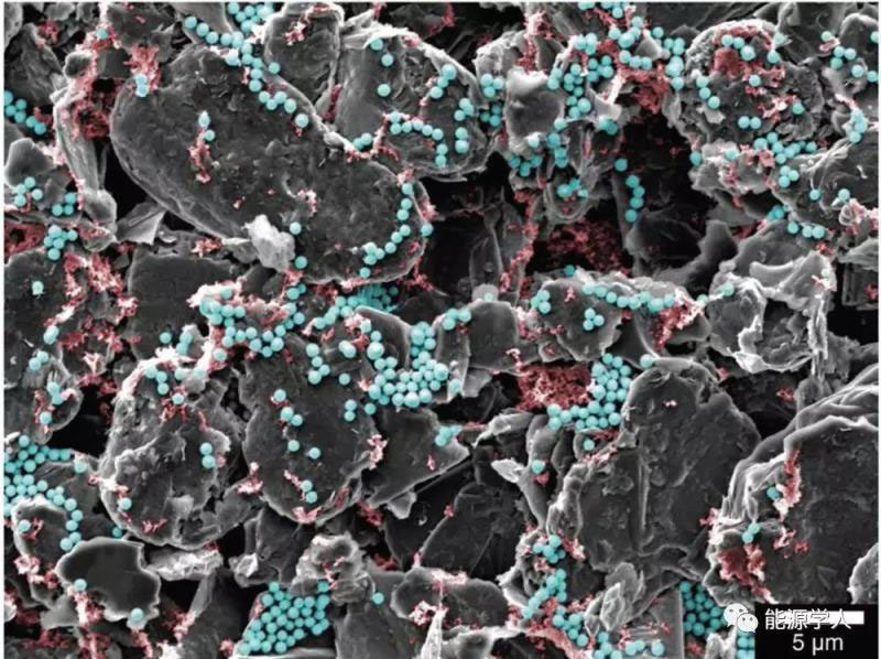圖8 石墨與石墨間孔隙(紅色)中Si顆粒(藍色)所組成的硅碳結(jié)構(gòu)。