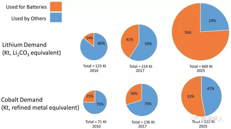 圖4 電池和其他應(yīng)用對鋰和鈷需求的變化。