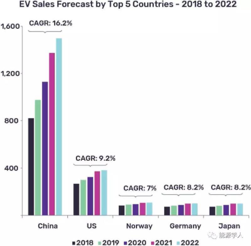 圖1 2017-2022年電動汽車銷售額全球前五名。
