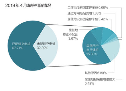 截止到2019年4月,通過(guò)充電聯(lián)盟成員內(nèi)整車企業(yè)采樣約82.96萬(wàn)輛車的車樁相隨信息,發(fā)現(xiàn)建設(shè)安裝私人充電樁的有56.2萬(wàn)輛,占67.71%;未隨車配建私人樁的有26.8萬(wàn)輛,占32.29%,接近1/3。從未配建私人充電樁的原因看,除了集團(tuán)用戶自行建樁占較高比例外,居住地物業(yè)不配合和居住地沒(méi)有固定停車位也是重要原因,這三個(gè)原因占比達(dá)71.1%,其余原因占比為28.9%。