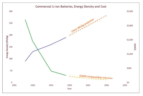 按目前的發(fā)展速度,鎳鈷錳(NCM)/鎳鈷鋁(NCA)的鋰離子電池的價(jià)格在2030年之前將降到100美元/kWh,并且能量密度將達(dá)到300Wh/kg。這些比率呈線性發(fā)展,如果技術(shù)得以更快的發(fā)展,這些指標(biāo)將更早得以實(shí)現(xiàn)。汽車行業(yè)促使電池產(chǎn)量不斷增加是取得這一進(jìn)步的主要驅(qū)動(dòng)力。