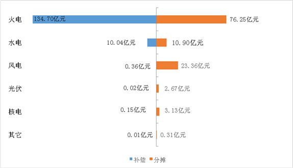 從能源類型的角度來看,電力輔助服務補償費用的補償與分攤費用對比如下(見圖5)。