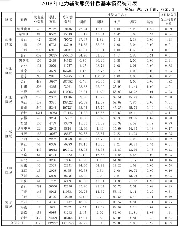 附件:2018年電力輔助服務補償基本情況統(tǒng)計表