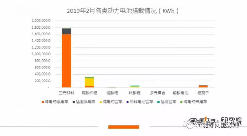 2月三元材料的搭載量為1.78GWh,其中乘用車占99.7%。三元材料搭載量占總搭載量的79.19 %,占比再次大幅提高。磷酸鐵鋰電池裝機320.4MWh,在月度裝機中的占比只有14.25 %。其中68.9%用于純電動客車,純電動乘用車和純電動專用車的裝機量則分別占到18.5%和12.6%。錳酸鋰和鈦酸鋰電池2月合計裝機75.4 MWh,占比3.35%,其中鈦酸鋰電池全部由銀隆新能源提供且全部用在客車市場上。