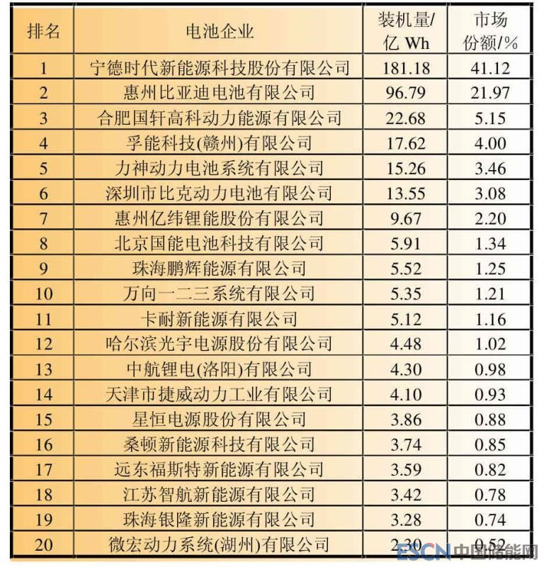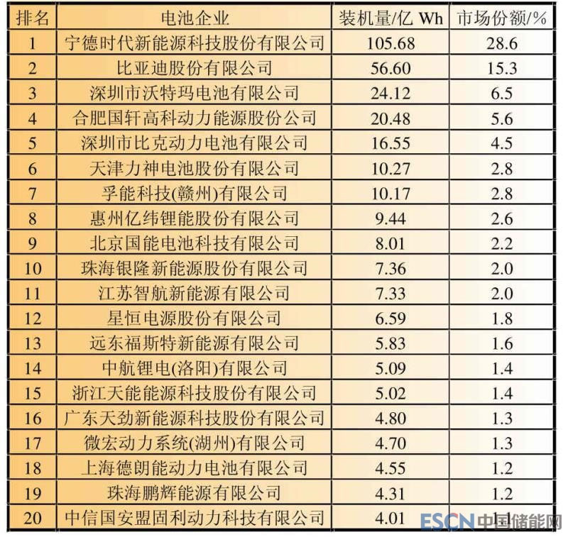 表5 2017年中國動(dòng)力鋰離子電池裝機(jī)量前20強(qiáng)企業(yè)