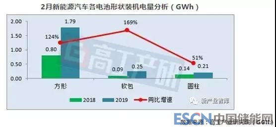 從不同電池形狀來看,2019年2月方形電池裝機(jī)電量約1.79GWh,同比增長(zhǎng)124%;軟包電池裝機(jī)電量約0.25GWh,同比增長(zhǎng)169%;圓柱電池裝機(jī)電量約0.21GWh,同比增長(zhǎng)51%。
