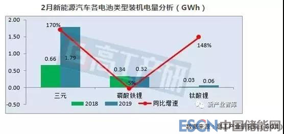 從電池類型來看,2019年2月磷酸鐵鋰電池裝機(jī)電量約0.32GWh,同比下降5%;三元電池裝機(jī)電量約1.79GWh,同比增長(zhǎng)170%;鈦酸鋰電池裝機(jī)電量約0.06GWh,同比增長(zhǎng)148%。