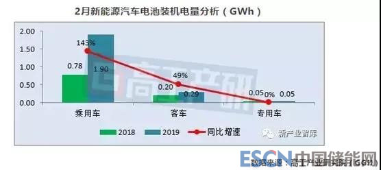 從車輛細(xì)分類別來看,2019年2月新能源乘用車電池裝機(jī)電量約1.90GWh,同比增長(zhǎng)143%;客車電池裝機(jī)電量約0.29GWh,同比增長(zhǎng)49%;專用車電池裝機(jī)電量約0.05GWh,與去年同期相比基本持平。