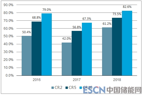 2018年,寧德時(shí)代的動(dòng)力電池市占率達(dá)到41.1%,比亞迪為20.1%,兩者均相比2017年市占率大幅提升,合計(jì)占約61%。TOP10以外的其他電池企業(yè)總市占率由2017年的32.7%下降至17.4%,說明小規(guī)模、低端的電池產(chǎn)能在逐步萎縮,行業(yè)格局向頭部企業(yè)集中。2018年的動(dòng)力電池CR2、CR5和CR10分別達(dá)到64.9%、77.7%和82.6%。