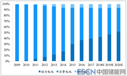 從2011年起,全球動(dòng)力電池占鋰離子電池消費(fèi)總量的比例逐年攀升。新能源汽車行業(yè)的逐步發(fā)展帶動(dòng)了動(dòng)力電池的需求,2011-2017年,動(dòng)力電池占鋰電池的比例從4.5%提升至39.8%,出貨量年均復(fù)合增速為83.6%。根據(jù)預(yù)測,到2020年動(dòng)力電池占鋰電池的比例有望達(dá)到52%,超過消費(fèi)電池。