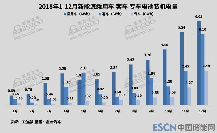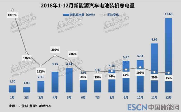 中國儲能網(wǎng)訊:2018年12月我國新能源汽車生產(chǎn)22.6萬輛,同比增長16.0%,環(huán)比增長17.7%。2018年全年新能源汽車生產(chǎn)122.1萬輛,同比大幅增長50.7%。其中新能源乘用車產(chǎn)量為99.4萬輛,同比增長80.7%。根據(jù)蓋世汽車研究院統(tǒng)計,2018年12月動力電池裝機量13.60 GWh,同比增長15.4%。2018年全年動力電池裝機量為57.35GWh,同比增長57.0%,其中新能源乘用車裝機量達到32.86GWh,占總裝機量的57.3%,同比增長137.0%,成為動力電池的主要需求增長點。