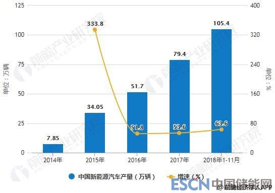 2014-2018年1-11月中國新能源汽車產(chǎn)量統(tǒng)計及增長情況