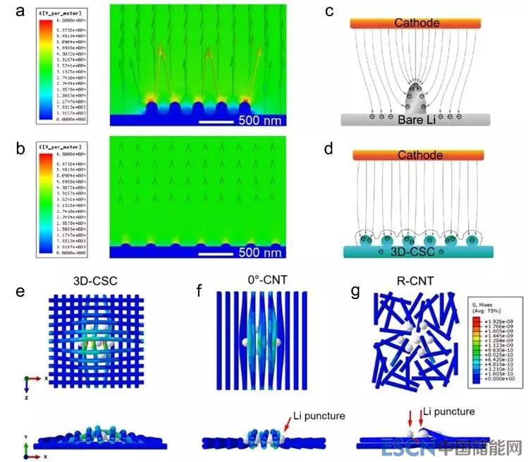 圖1. (a)-(d)常見鋰箔負(fù)極和鋰/碳管骨架復(fù)合電極鋰沉積的仿真電場模擬及示意圖,具有高比表面積的3D-CSC導(dǎo)電骨架能有效避免電勢集中,促進(jìn)均勻沉積。(e)-(g)不同幾何結(jié)構(gòu)碳納米管骨架在鋰金屬沉積量增大時的應(yīng)力分析模擬。