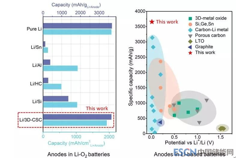 圖2. 交錯碳納米管復(fù)合鋰金屬負(fù)極(Li/3D-CSC)與其他應(yīng)用于鋰氧電池中的負(fù)極性能對比(左)及與其他典型鋰電極的性能對比(右)。