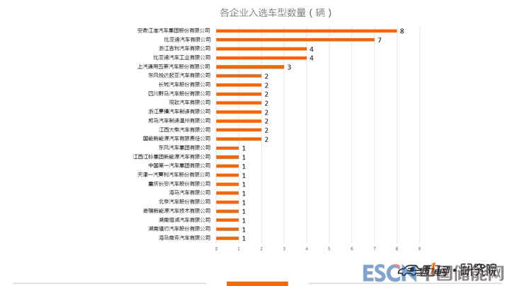 就生產(chǎn)企業(yè)來(lái)說(shuō),本批目錄中,江淮汽車數(shù)量最多,有8款車型入選,比亞迪汽車有限公司以7款的成績(jī)排名第二。