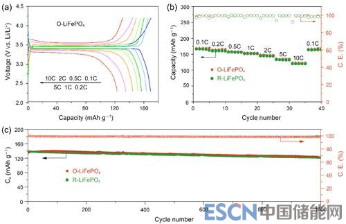 圖4 原始的O-LiFePO4/C和回收的R-LiFePO4/C的電化學(xué)性能曲線。(a)O-LiFePO4/C在0.1–10C不同倍率范圍內(nèi)的典型充放電曲線。(b)倍率性能。(c)O-LiFePO4/C和R-LiFePO4/C在3C倍率下的長(zhǎng)循環(huán)穩(wěn)定性。3C對(duì)應(yīng)的充電或放電時(shí)間為20分鐘。