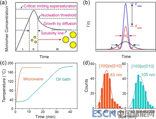 圖1 經(jīng)典的LaMer形核和生長(zhǎng)機(jī)制以及實(shí)驗(yàn)結(jié)果。(a)經(jīng)典LaMer機(jī)理,顆粒在溶液中成核和生長(zhǎng)過(guò)程中單體濃度變化的示意圖。(b)三個(gè)具有高斯分布的形核函數(shù)。形核函數(shù)的寬度()對(duì)應(yīng)形核時(shí)間窗口。(c)微波加熱和油浴加熱兩種加熱模式下的原位溫度與時(shí)間曲線。(d)由兩種不同的加熱模式制備的LiFePO4沿[100]或[010]方向的尺寸統(tǒng)計(jì)。微波加熱的尺寸為63nm,而在常規(guī)油浴加熱的情況下,尺寸為105nm。