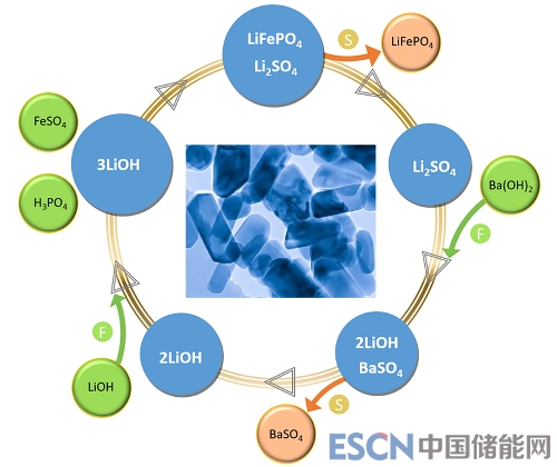 圖2 LiFePO4納米晶水熱合成路線及鋰回收示意圖。以LiOH、FeSO4和H3PO4為原料制備納米LiFePO4。用Ba(OH)2做沉淀劑與濾液反應(yīng),隨后進(jìn)行固液分離,回收LiOH。插圖為L(zhǎng)iFePO4的TEM照片。