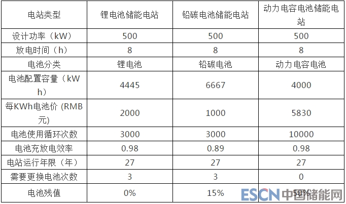 現(xiàn)以三種不同電池,按照500kW-8h(4000kWh)儲(chǔ)能電站,分別比較儲(chǔ)能電站成本與效益。見(jiàn)下表1~表2。