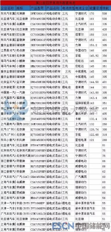 從續(xù)航來看,本批次目錄有2款乘用車續(xù)航達到了500公里,分別為東風集團的風神牌純電動轎車和比亞迪的純電動多用途乘用車,由寧德時代和比亞迪提供配套,能量密度分別為170Wh/kg和161Wh/kg,均為三元電池。