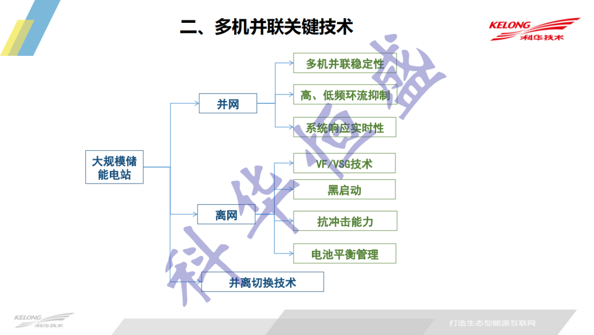 下面介紹一下并機(jī)技術(shù)。科華主要從三個方面介紹這一塊。并網(wǎng)方面,科華主要有三個點,對電網(wǎng)的大規(guī)模應(yīng)用會比較突出的一個點,就是多機(jī)并聯(lián)的穩(wěn)定性,還有高、低頻環(huán)流,還有系統(tǒng)響應(yīng)性,離網(wǎng)功能的話也是它很重要的一個功能,主要是VF/VSG技術(shù)的探討,還有離網(wǎng)的黑啟動,還有抗沖擊能力、電池平衡管理。