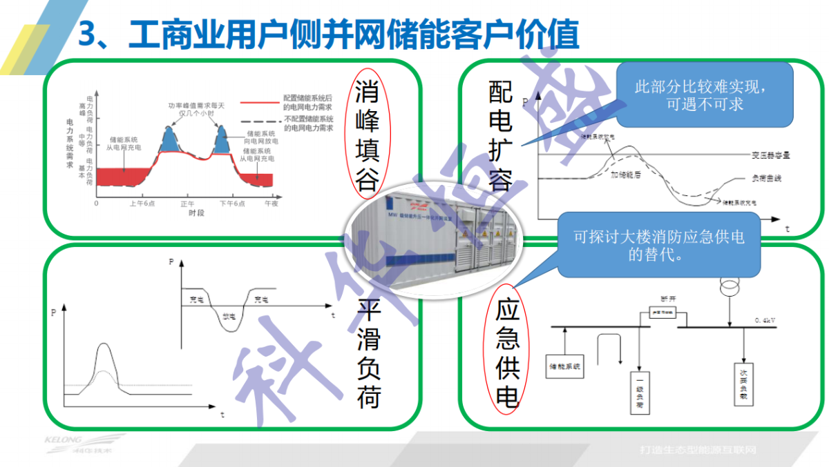最后介紹一下我們并機(jī)的專利技術(shù),并機(jī)在我們公司是比較早已經(jīng)具備這個能力,而且是國內(nèi)首家具備這種能力的公司,在2004年的時候,我們創(chuàng)始人就已經(jīng)申請這么一個專利并聯(lián)技術(shù),所以我們在儲能并聯(lián)系統(tǒng)上的一個優(yōu)勢還是比較突出的。接下來簡單介紹一下應(yīng)用方案和案例,這是調(diào)峰調(diào)頻的解決方案,主要是補(bǔ)償原有的一個發(fā)電機(jī)組的控制、相應(yīng)速度慢的問題,由前面的藍(lán)色通過加入儲能后變成后面紅色的這么一個波形。還有計劃性的解決方案也可以儲能系統(tǒng),平滑或者再利用光伏新能源的能量。這是用戶側(cè)的儲能解決方案,這套系統(tǒng)可以實現(xiàn)并網(wǎng),也可以實現(xiàn)離網(wǎng),也可以實現(xiàn)并離網(wǎng)切換。