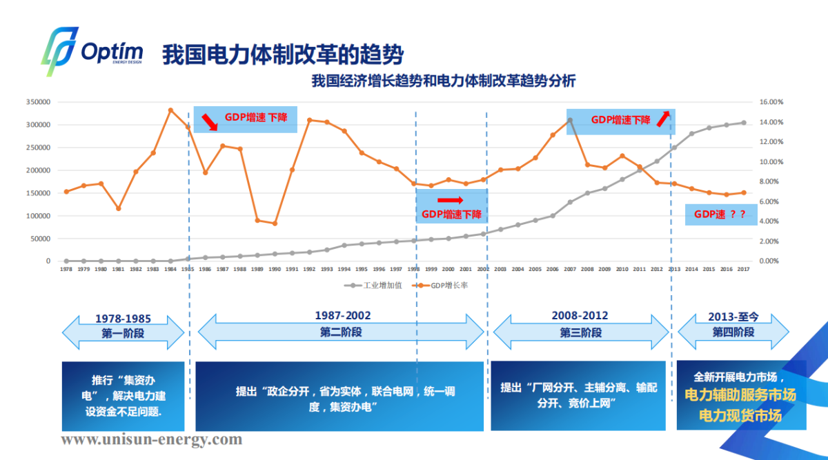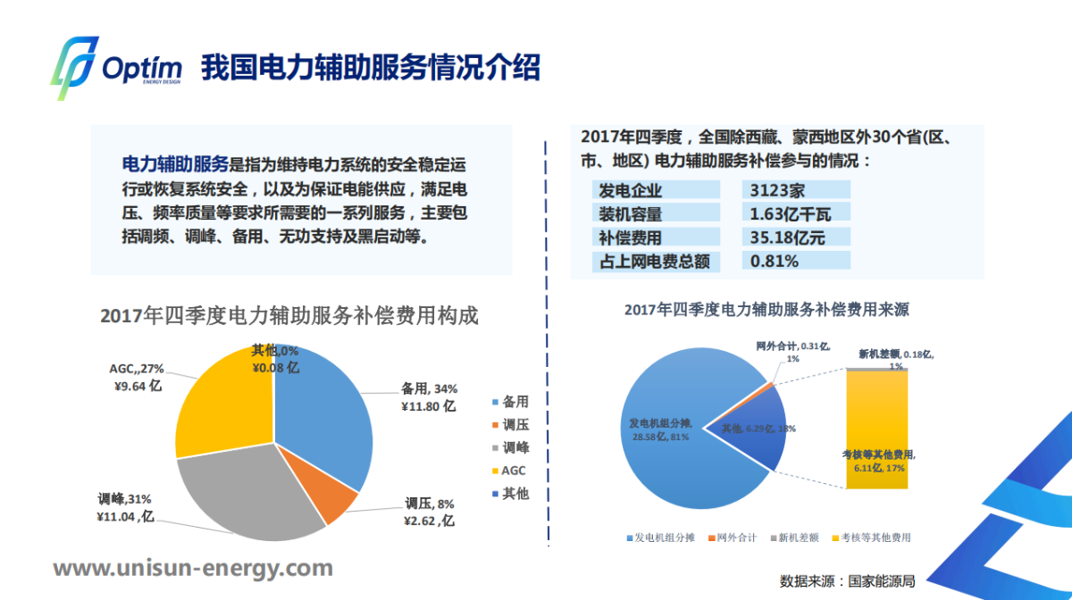 這頁PPT展現(xiàn)的是我國電力體制改革和我國經(jīng)濟(jì)增速的趨勢分析,下一頁PPT講的主要介紹我國輔助服務(wù)市場,從交易品種來看,主要包括調(diào)峰、調(diào)頻、備用、無功支持及黑啟動等,實際上總體來看,現(xiàn)在國家的幾大區(qū)域的電網(wǎng)連接是比較緊密的,出現(xiàn)大規(guī)模停電的可能性比較小,所以電網(wǎng)的供電保證不是主要矛盾,調(diào)峰、調(diào)頻才是目前主要的部分。目前我國輔助服務(wù)的繳費主體還是以常規(guī)的火力發(fā)電為主,值得欣喜的是在一些省已經(jīng)把新能源電站也納入了輔助服務(wù)的繳費主體。此外在廣東,就是電力體制改革的前沿,提到了參與電力交易的大用戶,也納入到我國的輔助服務(wù)的繳費主體范圍。
