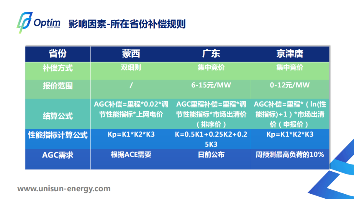 我們團(tuán)隊對三個具有代表性的省份:蒙西、廣東和京津唐在AGC補償規(guī)則方面作了整理和分析。蒙西采用的是兩個細(xì)則;廣東和京津唐采用集中定價的交易模式。從報價方案來說,蒙西不需要報價,廣東和京津唐都有報價區(qū)間的要求;蒙西電網(wǎng)的收益主要與調(diào)節(jié)性能指標(biāo)、里程、上網(wǎng)電價有關(guān)系;廣東電網(wǎng)是由里程、調(diào)節(jié)性能指標(biāo)、市場出清價決定的;在京津唐電網(wǎng)補償是跟里程、市場出清價有關(guān)。蒙西電網(wǎng)現(xiàn)在使用的是ACE考核;廣東每天會公布次日24小時的調(diào)頻需求,一般按照負(fù)荷的1%到3%測算的,京津唐是按照周預(yù)測的10%測算的。