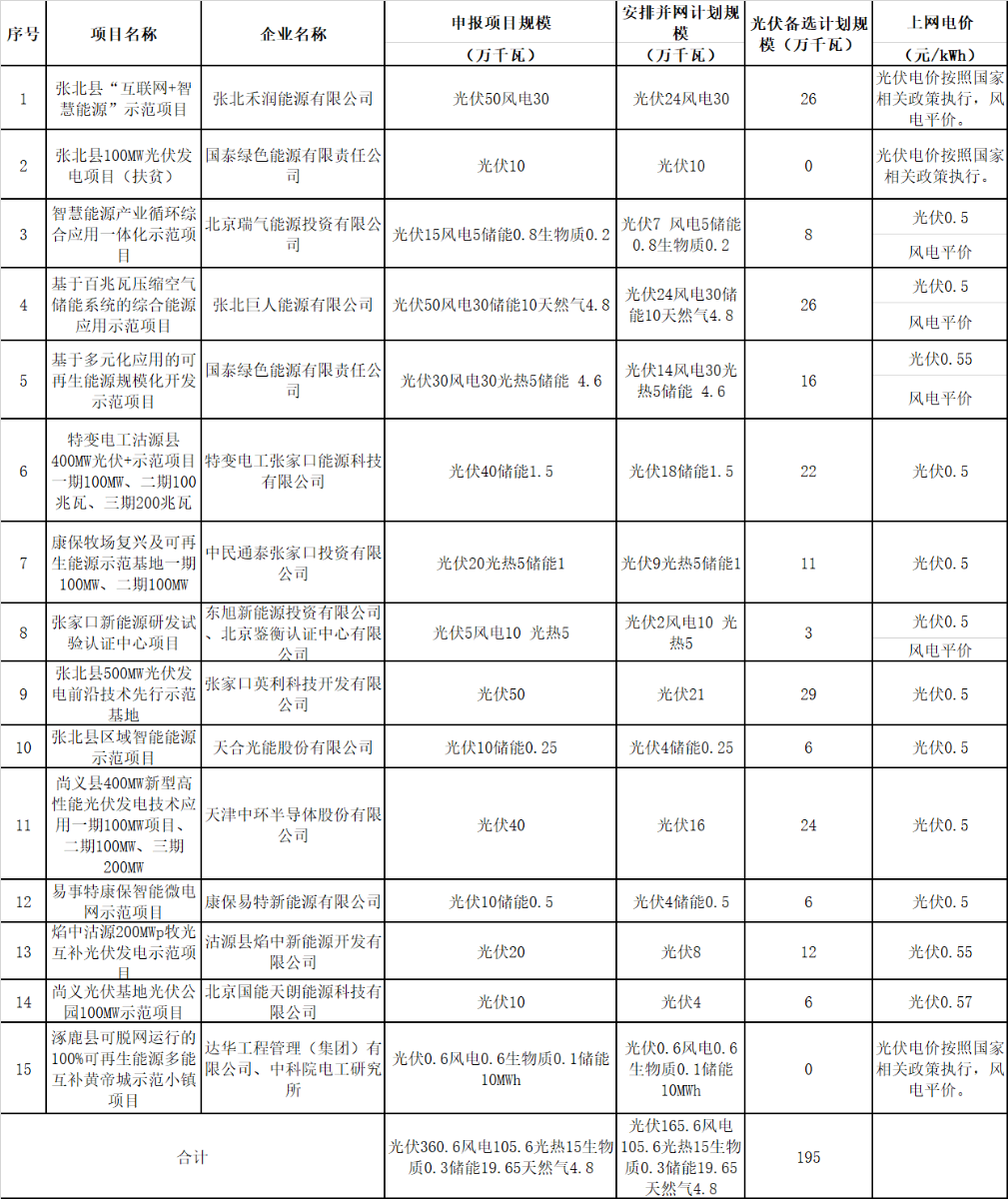 3.列入備選計劃的規(guī)??赏⒕W(wǎng)計劃一并進行備案,后視張家口示范區(qū)項目整體建設(shè)情況和電網(wǎng)接入條件相應(yīng)調(diào)整替補或安排到2020年后并網(wǎng)計劃。