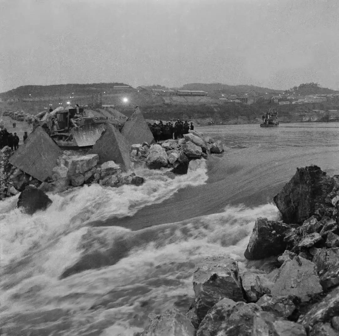 △ 湖北鄖縣丹江黃龍灘,20世紀50年代中,鄖縣民兵峭壁排險