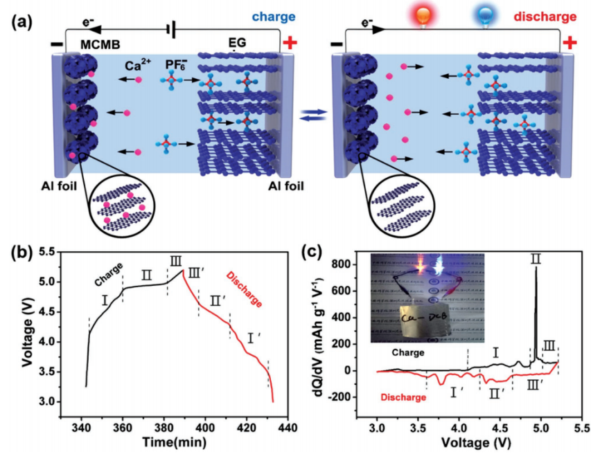 鑒于此,唐永炳及其團隊成員吳石、張帆等人成功研發(fā)出一種基于雙碳結構的鈣型雙離子電池。該電池材料廉價易得并且環(huán)保,采用膨脹石墨作為正極材料,PF6-陰離子可以在其片層結構中可逆地嵌入/脫出;采用中間相碳微球作為負極材料,Ca2+可以在其片層結構中可逆地嵌入/脫出。電解液采用基于六氟磷酸鈣做電解質(zhì)的碳酸酯類電解液。研究表明,該鈣型雙離子電池可以在室溫下實現(xiàn)可逆充放電,并且表現(xiàn)出優(yōu)異的電化學性能:平均工作電壓高達4.6V,1C倍率下循環(huán)300圈后容量保持率為94%。這種新型鈣離子電池結構設計為鈣離子電池的研究開拓了新思路,也為基于多價金屬離子電池的研究提供了借鑒意義。