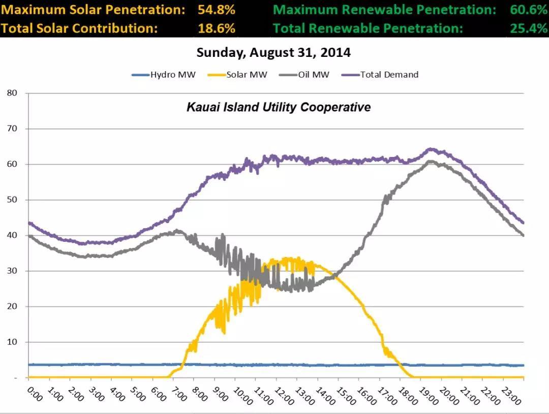 以考艾島公用事業(yè)合作社為例,在2014年8月31日(星期天)的負荷曲線圖,光伏負荷滲透率達到54.8%,光伏電量貢獻率達到18.6%。