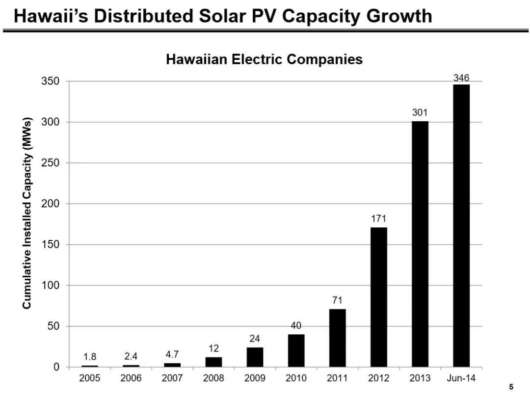 由于光伏成本的快速下降和電網(wǎng)技術的進步,夏威夷州的光伏裝機量呈現(xiàn)指數(shù)增長,從2005年1.8MW到2014年年初346MW。