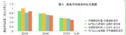 當(dāng)前至2030年,電力需求保持較快增長,且新能源發(fā)電等新技術(shù)仍處于發(fā)展期,電力系統(tǒng)總成本持續(xù)上升。2030~2050年,電力需求增長逐漸趨于飽和,新能源發(fā)電等技術(shù)日益成熟,系統(tǒng)成本進(jìn)入下降期,此階段能源發(fā)展的低碳性目標(biāo)與經(jīng)濟(jì)性目標(biāo)逐漸重合。相比于電力系統(tǒng)總成本,度電平均成本的達(dá)峰時(shí)間更早,預(yù)計(jì)2050年度電成本約為當(dāng)前水平的一半左右。