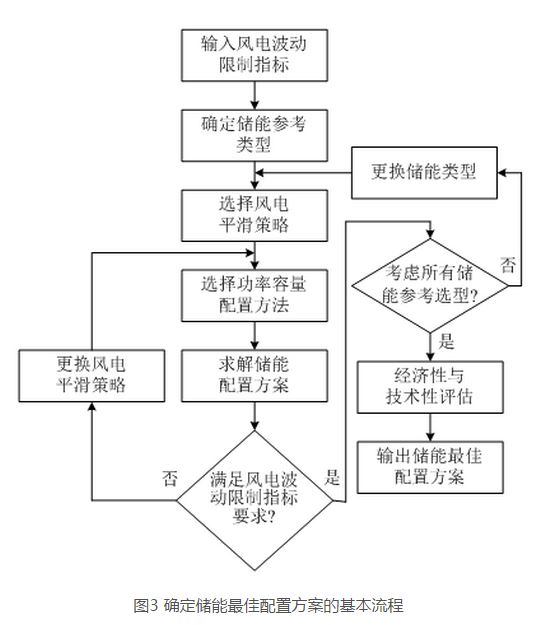 綜合儲能系統(tǒng)的類型選取、風電平滑策略及功率容量配置方法,本文提出一種確定儲能最佳配置方案的方法,如圖3所示。