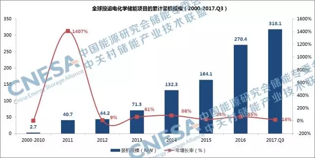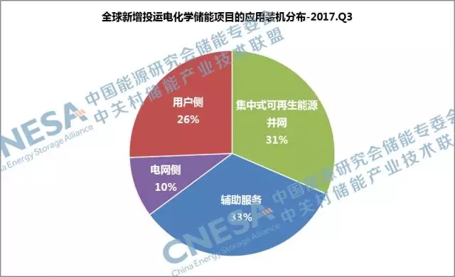 2017年第三季度,全球新增投運電化學儲能項目的裝機規(guī)模為94.4MW,同比增長551%,環(huán)比增長50%。