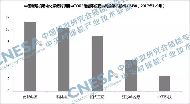 從企業(yè)排名上看,2017年三季度,全球新增投運儲能項目中,裝機規(guī)模排在前十位的儲能系統(tǒng)提供商的總裝機規(guī)模,占全球2017年三季度新增投運項目裝機規(guī)模的82%。其中,鋰電企業(yè)排在榜單的前四位,并且一共占據(jù)了榜單八個席位,圣陽電源和南都電源是榜單中僅有的兩家鉛蓄電池企業(yè)。
