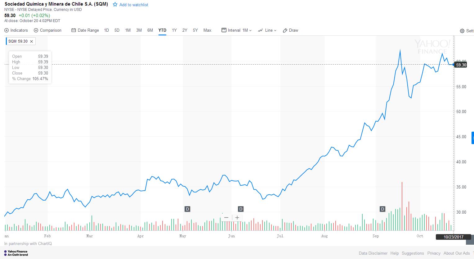 隨著各國大力發(fā)展電動(dòng)車,以及出臺(tái)“禁售燃油車時(shí)間表”,鋰的需求大增。今年以來,SQM在紐交所的股價(jià)已經(jīng)上漲約105%。