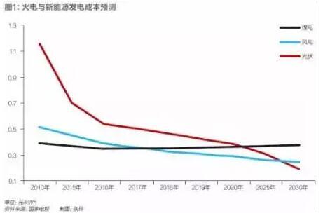 我國(guó)部分地區(qū)新能源的價(jià)格已經(jīng)與煤電價(jià)格相當(dāng),預(yù)計(jì)到2030年,光伏發(fā)電成本可以達(dá)到0.2元/千瓦時(shí),風(fēng)電達(dá)到0.22元/千瓦時(shí)(見(jiàn)下圖)。