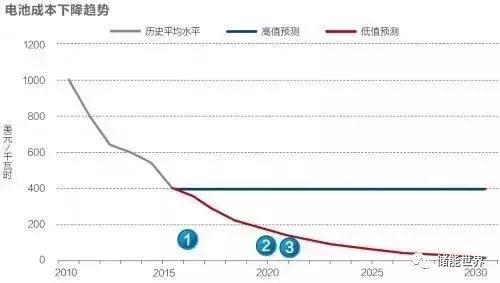 不過隨著科學(xué)技術(shù)的進一步發(fā)展,儲能電池成本也一直在持續(xù)下降,從2010年前后的超過1000美元每千瓦時已下降到目前的400美元每千瓦時。通用汽車與特斯拉分別計劃到2021年和2020年將電池組件成本降低到120美元每千瓦時和100美元每千瓦時。