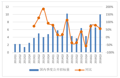 2016 年前三季度累計招標量為 24GW,較去年同期增長68%,創(chuàng)歷史新高。而對比 15年的搶裝現象,14 年同期的招標量僅為17.3GW,而14 年全年的招標量也僅為27.5GW,與今年相比明顯較弱。主要原因是區(qū)域電力企業(yè)及火電企業(yè)由于火電受限,同時風電成本下降投資回報率合理,轉型發(fā)展風電所致。