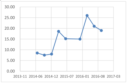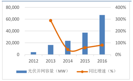2016 年受“630”上網電價下調的影響,光伏迎來史上最強搶裝潮。新增裝機容量達34.54GW,同比增 128%,其中地面電站為 30.3GW,占比 87.7%,分布式電站分別為4.24GW,2016 年底全國累計裝機容量達77.42GW。由于補貼拖欠以及棄光因素的影響,運營商面臨比較大的現金流壓力,導致信貸擴張能力弱的民營企業(yè)的退出。