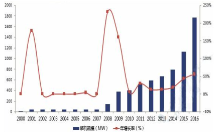 全球電化學儲能市場累計裝機規(guī)模(2000-2016)