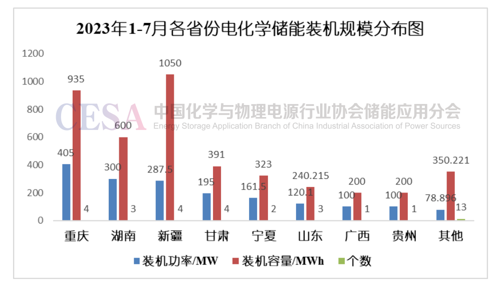 2023年7月,西部地區(qū)投運裝機規(guī)模占很大比例,西北區(qū)域裝機規(guī)模最大,共投運項目11個,總規(guī)模為644.2MW/1764.2MWh,甘肅、新疆、寧夏等省份發(fā)力,均有多個儲能項目投運,其中百兆瓦級儲能項目共3個,分別為新疆莎車80萬千瓦光伏+20萬千瓦/80萬千瓦時儲能一體化項目、寧東200萬千瓦復(fù)合光伏基地項目(二期)和金塔縣晶曦280MW/560MWh儲能電站一期100MW/200MWh項目。而西南區(qū)域裝機規(guī)模緊隨其后,共有8個項目投運,總規(guī)模為505.8MW/1136.4MWh,貴州、重慶兩地大型儲能項目投運,同樣有3個百兆瓦級儲能項目:重慶高新區(qū)科學(xué)谷100MW/200MWh儲能電站、中核紫云200MW/400MWh儲能電站(一期200MWh)和重慶合川區(qū)雙槐新型儲能電站,后者是重慶市最大新型儲能電站,裝機容量24萬千瓦,2小時能儲滿48萬度電,可滿足28萬戶居民在高峰時段的用電。華中區(qū)域總裝機規(guī)模為300MW/600MWh,由湖南投運的三個100兆瓦電網(wǎng)側(cè)儲能項目組成,華東和華南也各有一個百兆瓦級儲能電站投運。