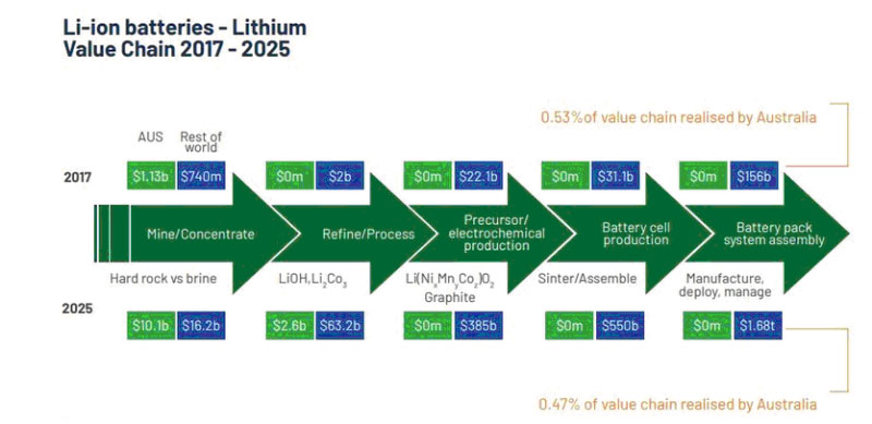 根據(jù)評(píng)估結(jié)果,盡管澳大利亞已經(jīng)占據(jù)了電池生產(chǎn)原料供應(yīng)市場的很大一部分,但澳大利亞卻錯(cuò)失了包括材料提煉在內(nèi)的下游加工以及電池生產(chǎn)和組裝等更大的市場機(jī)會(huì)。
