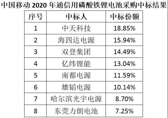 5月25日,中國鐵塔公布《2020年備用磷酸鐵鋰蓄電池組產(chǎn)品集約化電商采購項目中標(biāo)結(jié)果公示》,雙登集團(tuán)、南都電源、智泰新能源、鵬輝能源和中天科技5家企業(yè)預(yù)中標(biāo)。