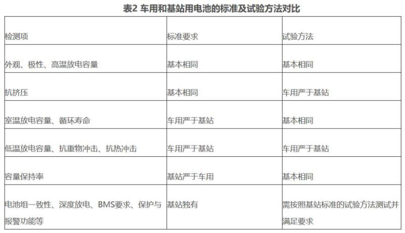 表2 車用和基站用電池的標準及試驗方法對比