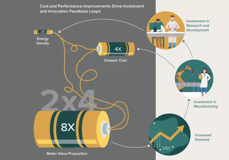在 2023 年之前,已經(jīng)實施中和計劃中的電池制造業(yè)總投資約為 1500 億美元。分析人士預(yù)計,新的計劃中的電池制造能力的硬性成本將從 2018 年到 2023 年下降一半以上。這讓電池迅速打開新的市場,性能和成本改進(jìn)的需求將鋰離子電池和新電池技術(shù)推向競爭極限,而且這比預(yù)期的速度更快。