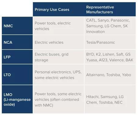 報告統(tǒng)計顯示,電動巴士和電網(wǎng)儲能所用的磷酸鐵鋰電池,制造商有比亞迪、力神、帥福得萬向A123等。電動汽車和電動工具所用的NCM三元電池,制造商企業(yè)有寧德時代、三洋、松下、三星、LG化學(xué)以及SKI等。