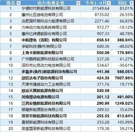 2019年前三季度動力電池裝機量TOP20